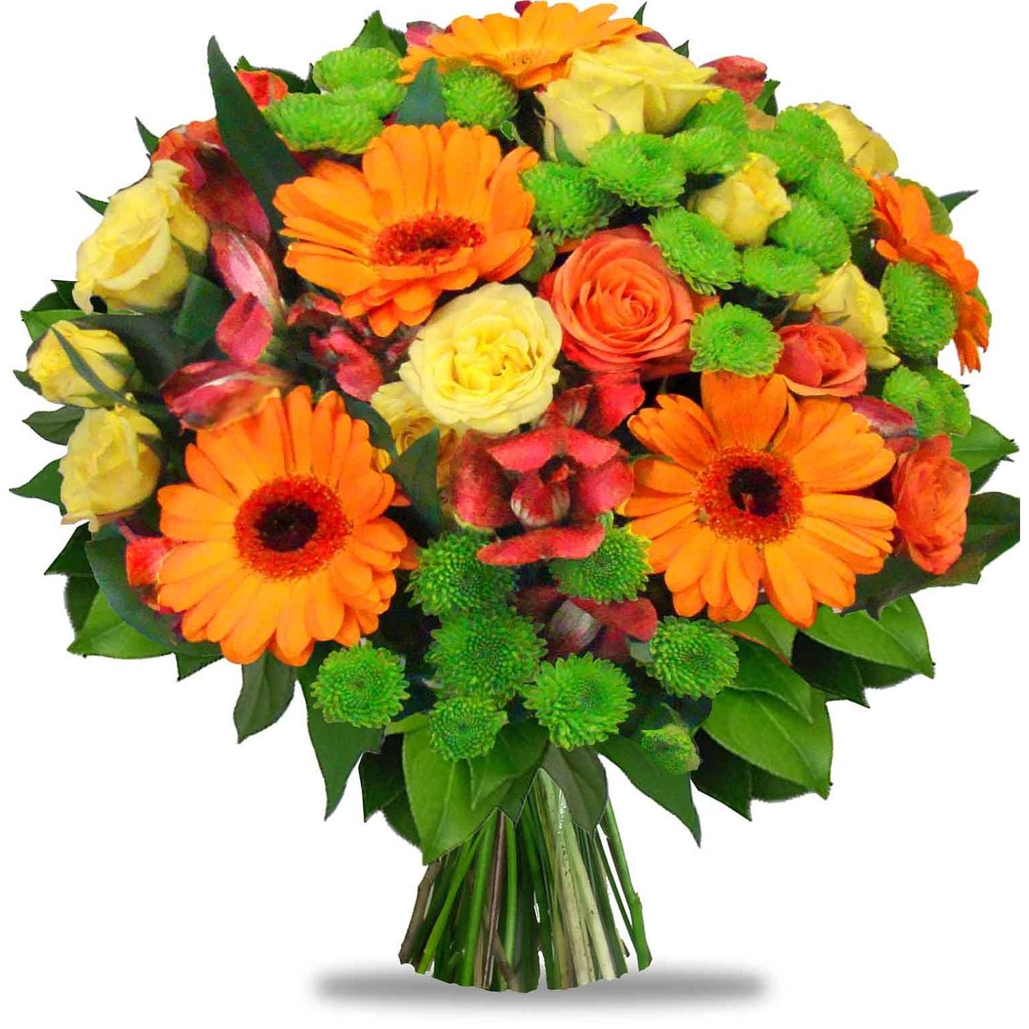 | Standardní | 3 ks germína, 2 ks chrysanthéma santini, 1 ks alstromerie, 4 ks růže a dekorativní zeleň (pistacie, salal) |