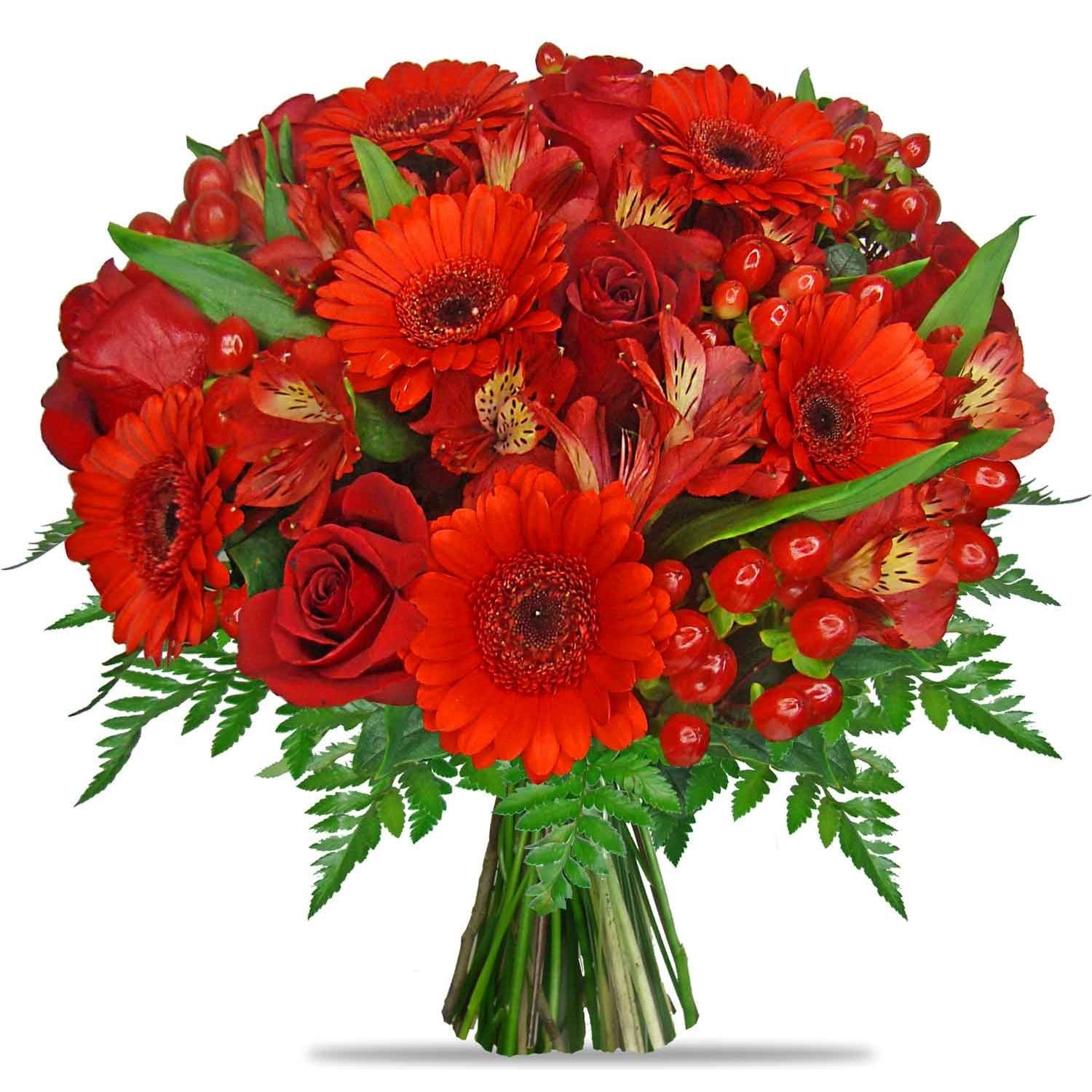 Tato kytice vyniká dokonalou harmonií sytě červených růží, germinek a alstromerií, které jsou vkusně doplněny bobulemi hyperica a decentní okrasnou zelení. Společně vytvářejí elegantní a energickou kompozici, která navodí pocit radosti a slavnostní atmosféry, ideální například k narozeninám, výročím či jako výraz poděkování. Kytice je pečlivě a profesionálně uvázaná našimi zkušenými floristy a klademe důraz na perfektní formu předání. Doručení zajišťujeme v den objednávky během pracovních dnů, s možností zvolit přesný čas doručení. O doručení vás vždy informujeme potvrzovacím e-mailem, takže máte jistotu, že vše proběhlo podle vašich představ.