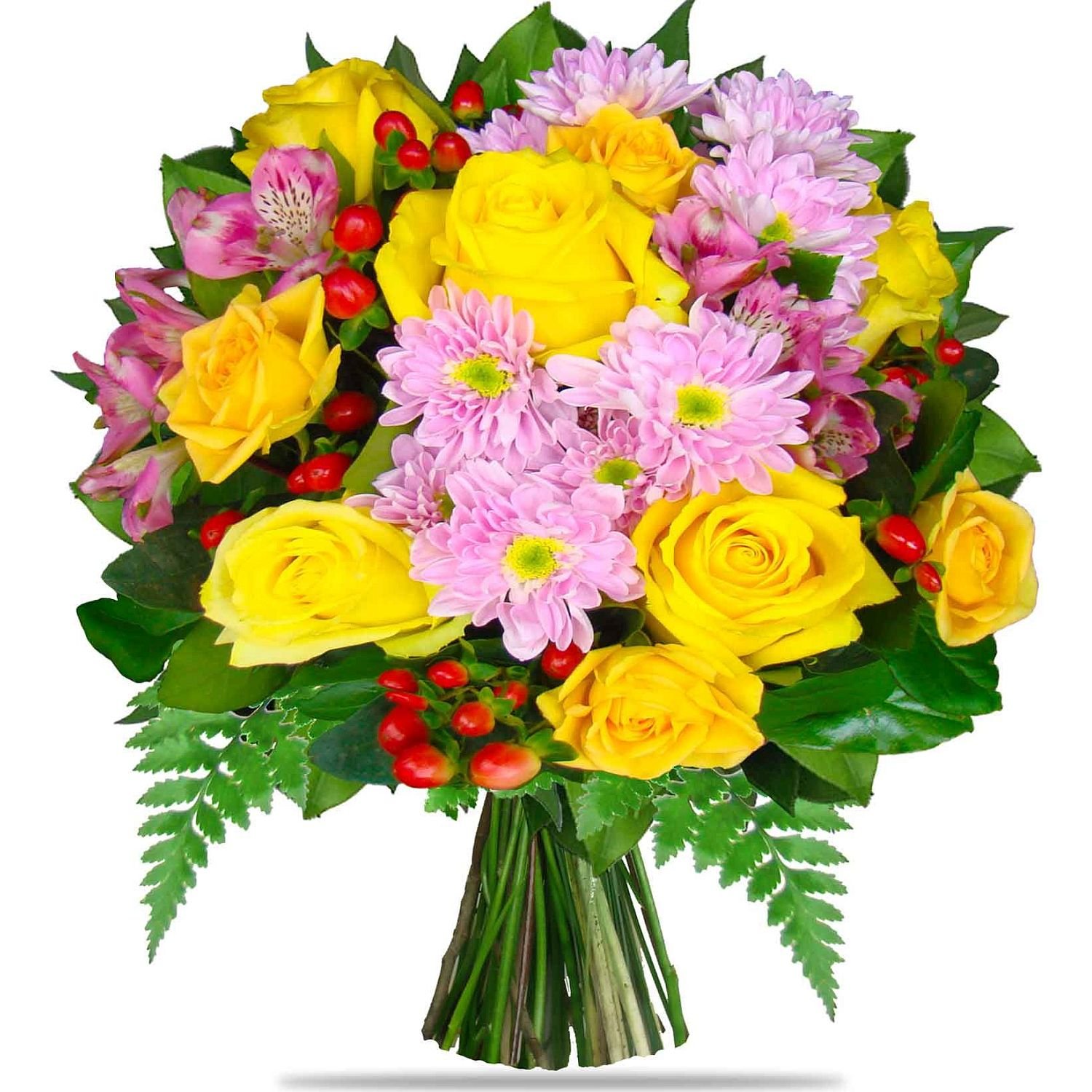 Tato kytice v sobě spojuje svěžest žlutých růží, jemnost alstromerií a růžových chryzantém, které jsou krásně doplněny červenými plody hyperica a dekorativní zelení. Společně vytvářejí harmonii teplých a veselých barev, působí optimisticky a přinášejí příjemnou atmosféru do každého prostoru. Ideálně se hodí pro poblahopřání k významné příležitosti, poděkování nebo potěšení někoho blízkého. Kytici pro vás vážou zkušení floristé, díky nimž každý detail ladí k dokonalosti. Doručujeme v den objednávky během pracovních dnů a samozřejmostí je jistota doručení i e-mailové potvrzení.