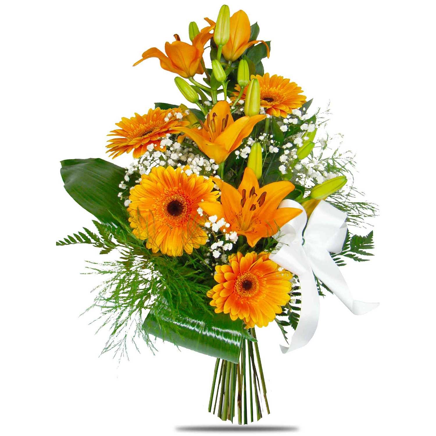 Tato elegantní kytice v teplých odstínech oranžové je dokonalým propojením noblesních lilií a veselých gerber, které doplňuje jemná gypsophila. Zářivé barvy a svěží zeleň vytvářejí radostnou atmosféru, takže se kytice skvěle hodí pro oslavy, gratulace i jako milé překvapení pro vaše blízké. Vše je vkusně svázáno ozdobnou mašlí, což podtrhuje slavnostní charakter aranžmá. Kytice je vždy profesionálně uvázaná našimi zkušenými floristy, abychom zajistili jen ten nejlepší výsledek. Doručujeme v den objednávky během pracovních dnů a můžete si zvolit přesný čas doručení. Samozřejmostí je potvrzení o doručení e-mailem.