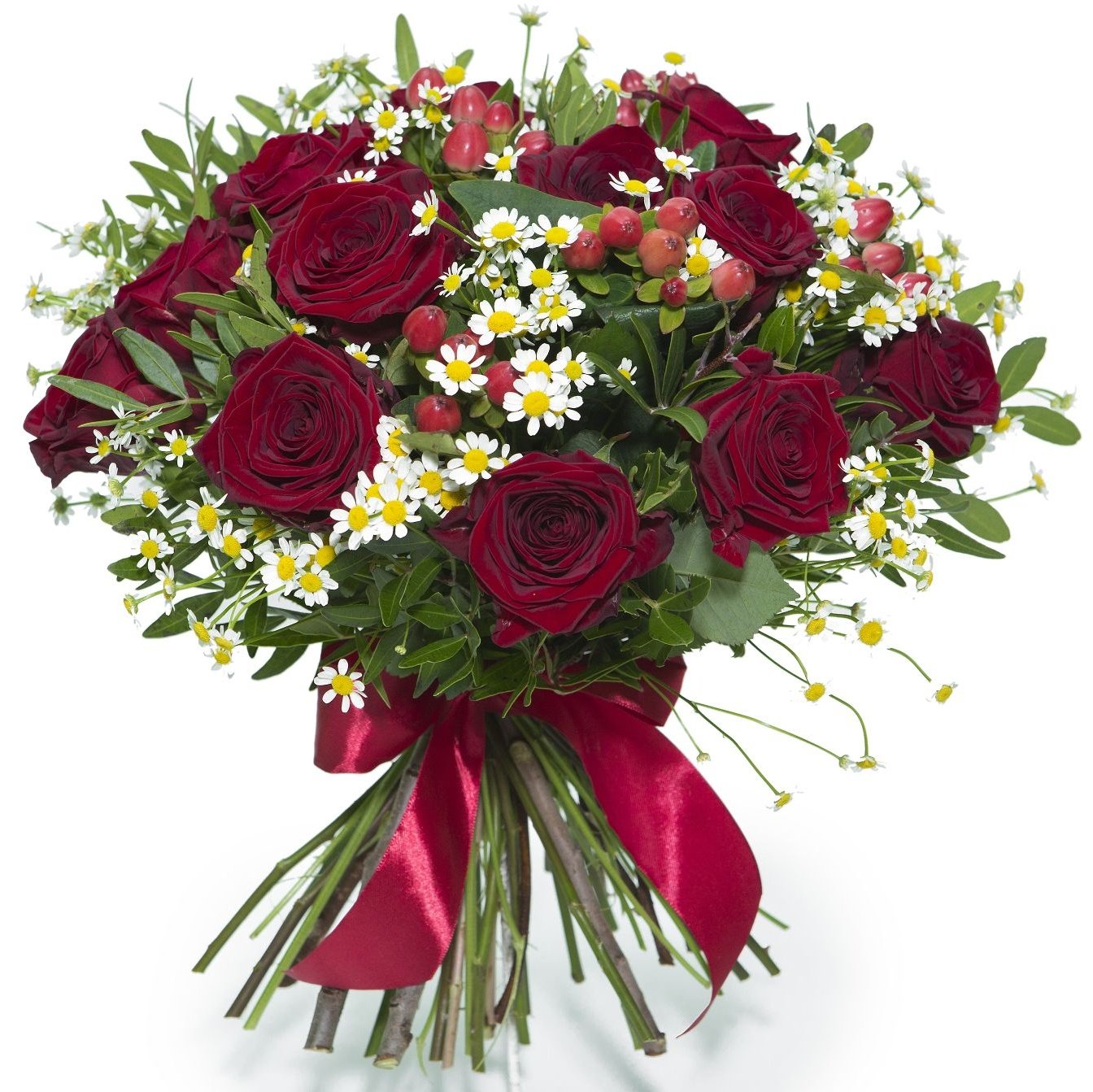 Tato elegantní kytice v sobě spojuje klasickou krásu rudých růží s hravostí bílých heřmánků a jemných hyperic, které společně vytvářejí vyvážený a působivý celek. Syté barvy růží ladí s drobnými kvítky a decentní zelení, která podtrhuje celkovou svěžest kytice. Výrazná ozdobná mašle dává vázání slavnostní nádech. Tento poetický kytici doporučujeme zejména k oslavám životních událostí, jako je výročí, narozeniny nebo vyjádření poděkování. Kytice je profesionálně uvázaná našimi zkušenými floristy. Doručujeme v den objednávky během pracovních dnů a u nás navíc můžete vybrat i přesný čas doručení. Jistotu doručení vám potvrdíme e-mailem.