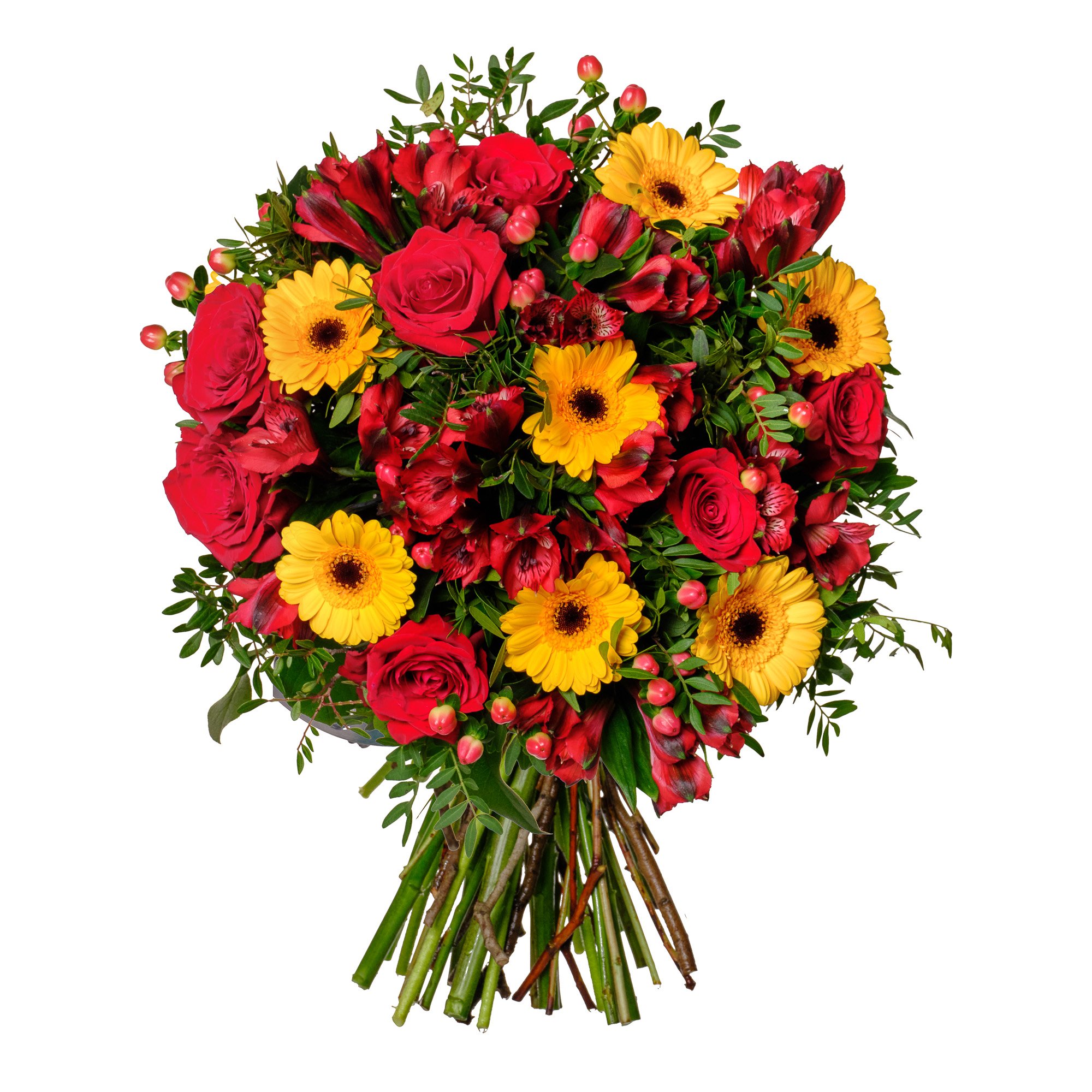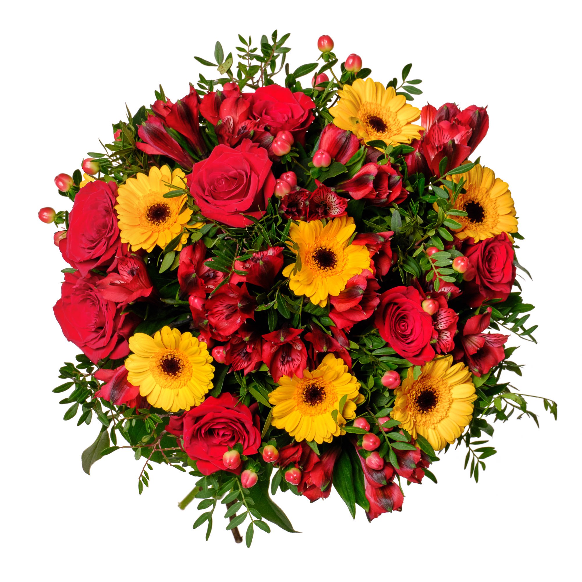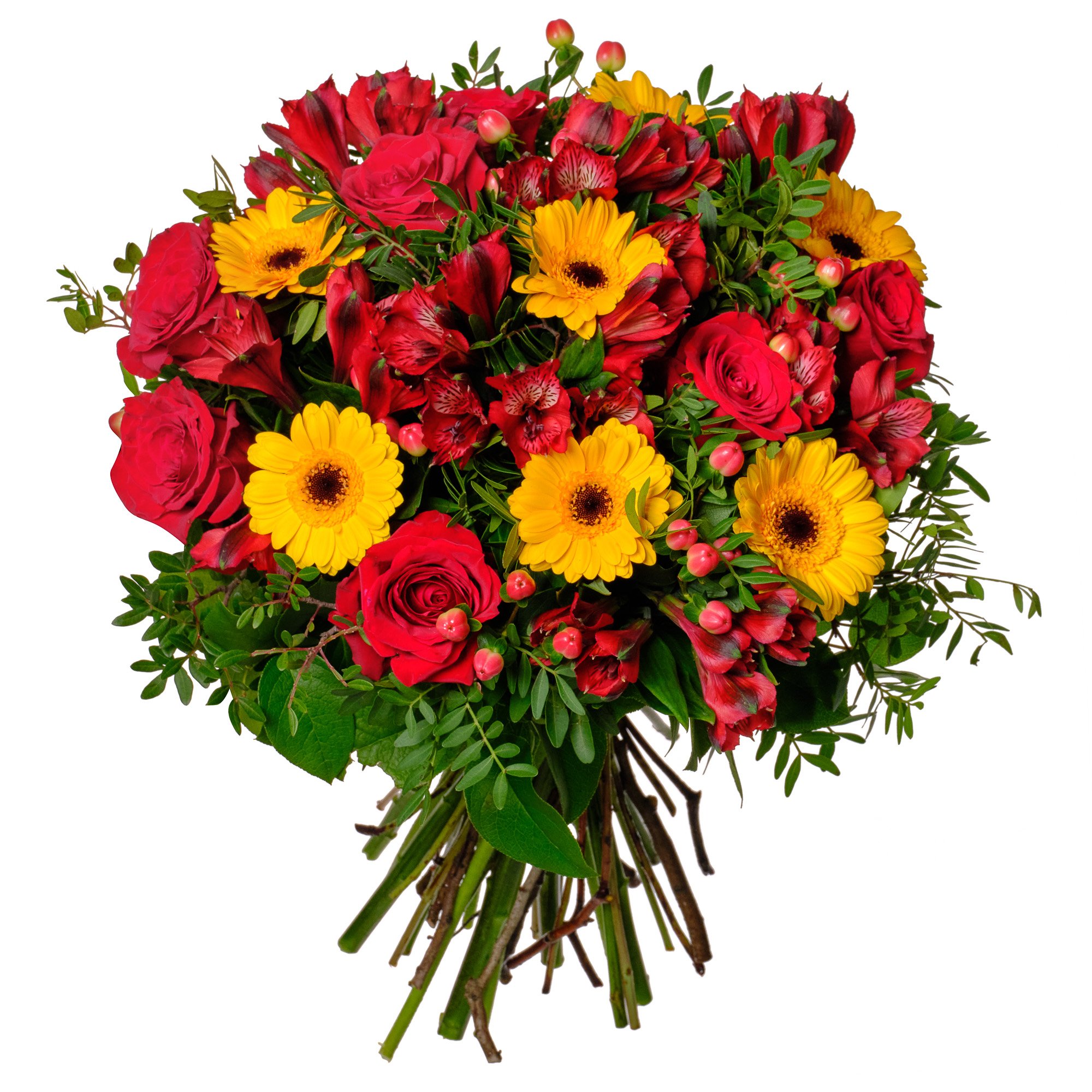Naše kytice z růží, gerber mini, alstromerií a hyperica září dokonale sladěnými barvami, které spolu vytvářejí energickou, radostnou atmosféru. Jasně žluté gerbery se krásně prolínají s hlubokými tóny červených růží a alstromerií, zatímco hypericum přidává jemný akcent. Výsledkem je kytice, která potěší při každé významné příležitosti – narozeniny, výročí nebo jako milé překvapení pro zpříjemnění dne vašim blízkým.