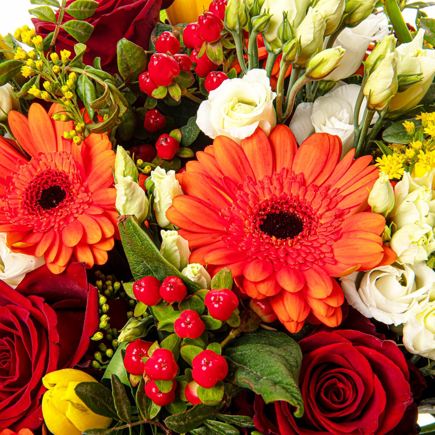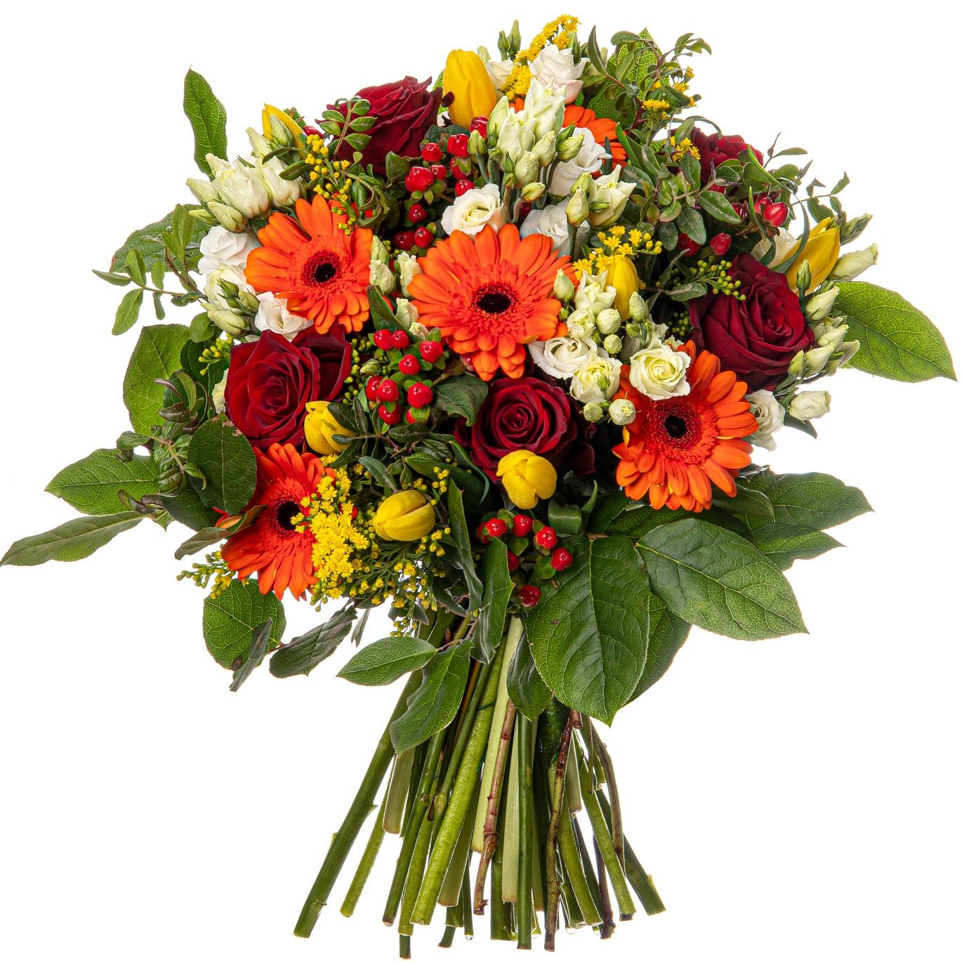 | Standardní | 3 ks růže červená, 3 ks gerbera mini oranžová, 3 ks hypericum, 3 ks eustoma, 5 ks tulipán žlutý, 3 ks solidago a dekorativní zeleň (solidago, pistacie, salal) |