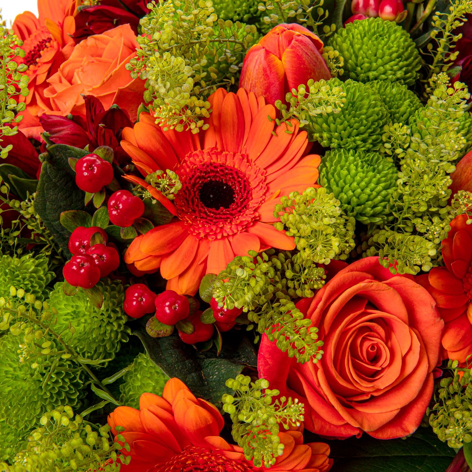 | Exkluzivní | 5 ks gerbera mini oranžová, 4 ks santini, 5 ks alstromerie červená, 7 ks růže oranžová, 5 ks hypericum, 7 ks tulipán oranžový a dekorativní zeleň (pistacie, salal) |