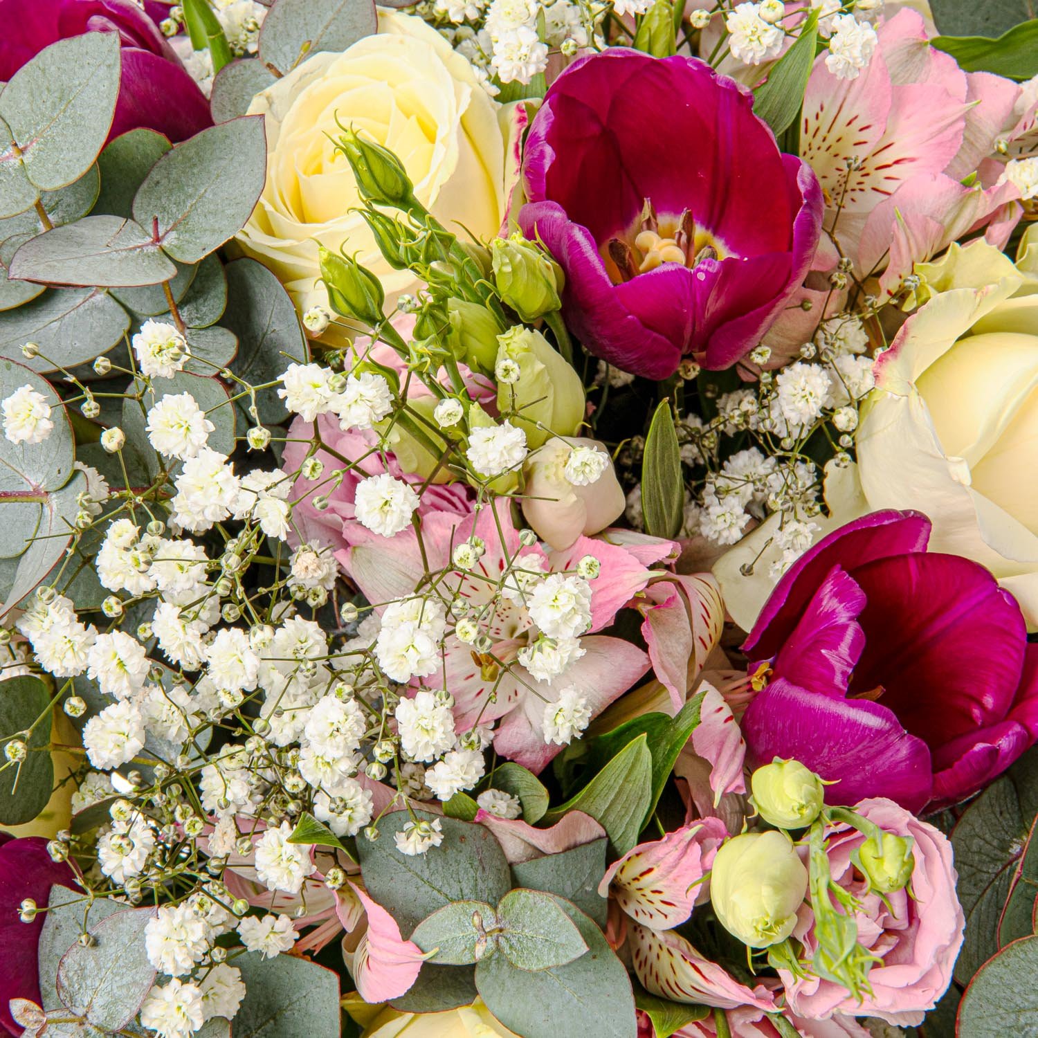 | Standardní | 3 ks eustoma, 3 ks alstromerie, 3 ks růže, 5 ks tulipán, 3 ks gypsophila a dekorativní zeleň (eucalyptus, rumora) |