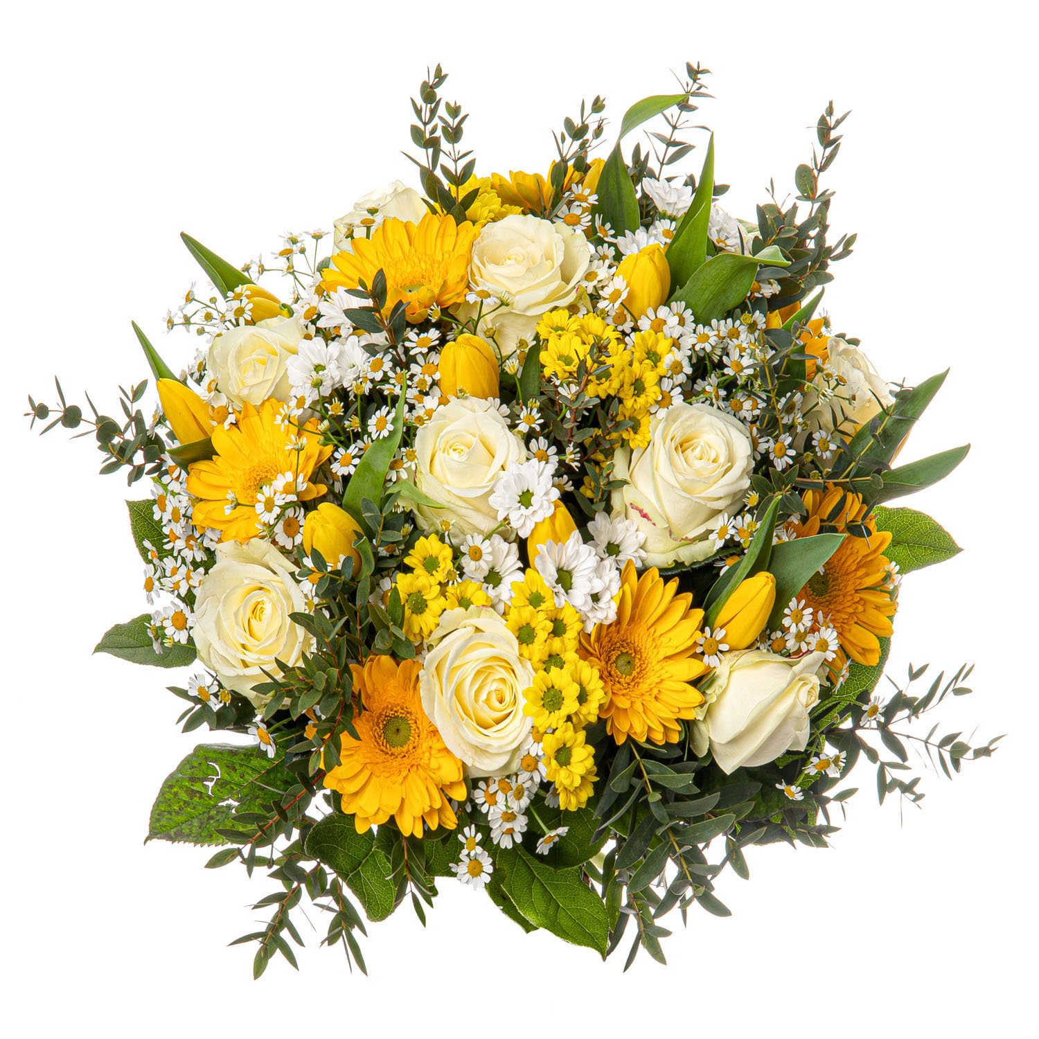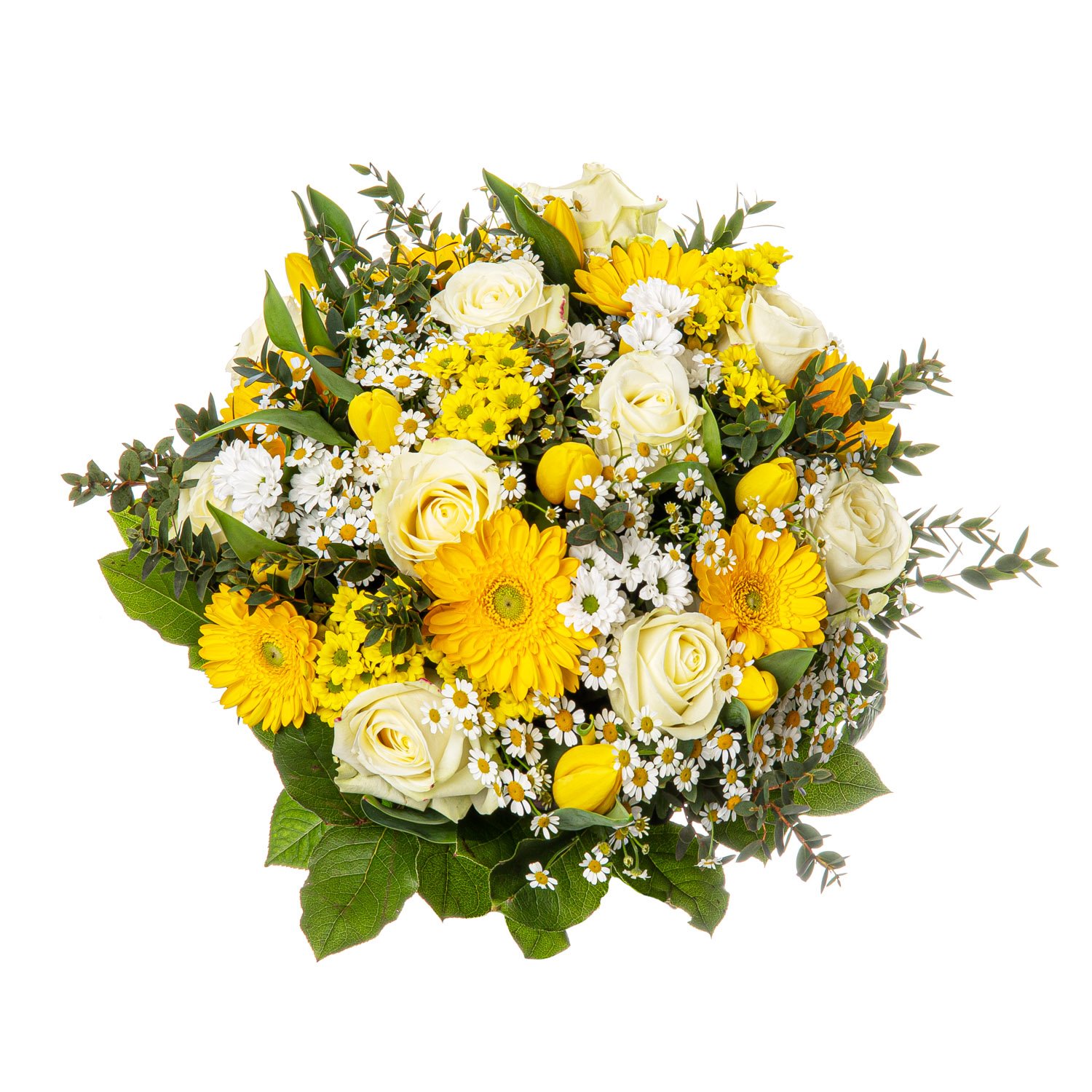 Naše květinová kytice propojuje jemné bílé růže a zářivé žluté gerbery s hravými tulipány a veselými kvítky heřmánku. Společně vytvářejí harmonii svěžesti, optimismu a příjemné energie. Dominantní žluté tóny v kombinaci s bílou působí vřele a rozzáří každý interiér. Hodí se skvěle jako dárek k narozeninám, k oslavám i pro potěšení blízkých ve všední den. Květiny vážeme profesionálně a s citem pro detail, dbáme také na precizní předání – doručujeme v den objednávky během pracovních dnů a můžete si zvolit přesný čas doručení. Potvrzení o předání posíláme e-mailem.