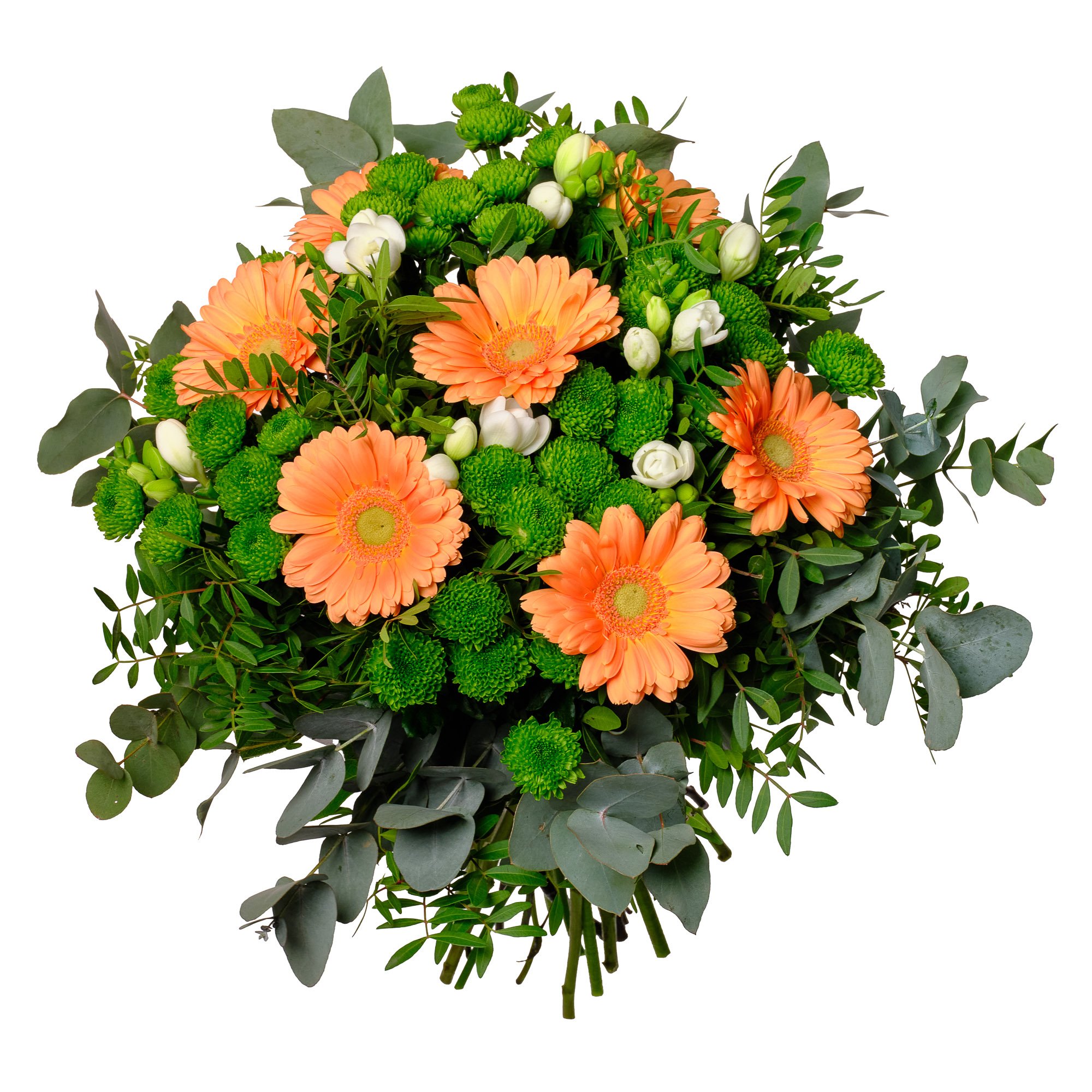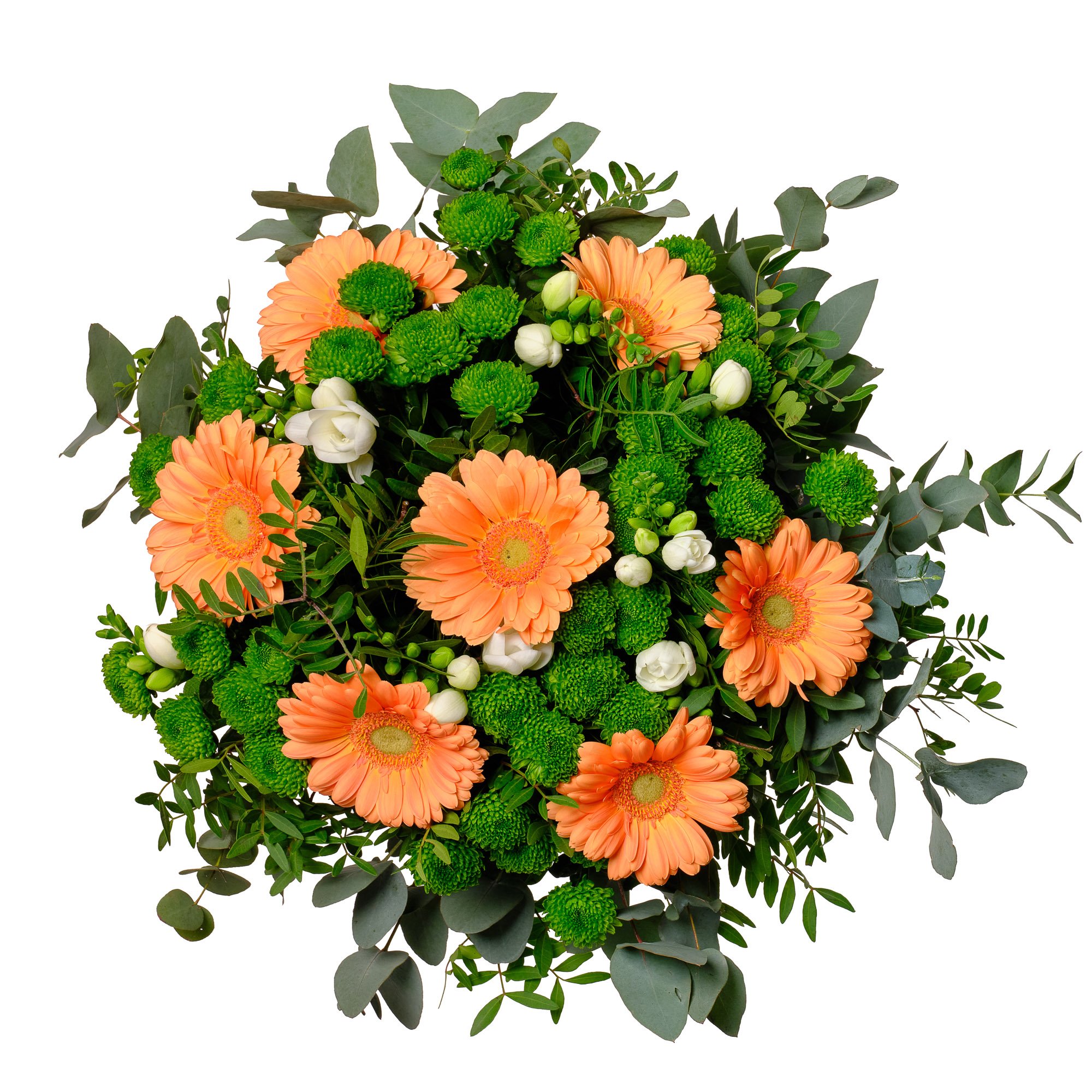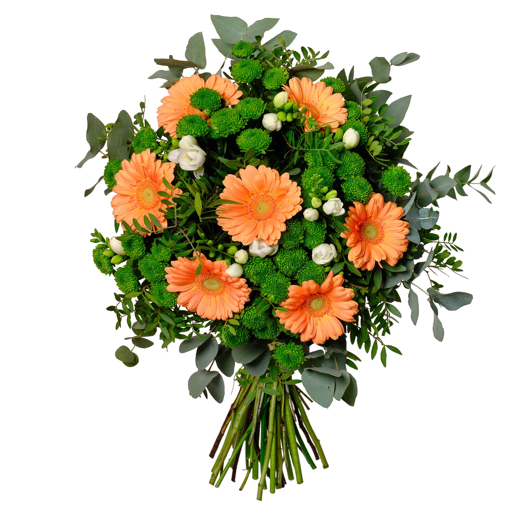 Tato svěží kytice z jemně oranžových gerber mini, bílých frézií a výrazných zelených santini působí nesmírně optimisticky a harmonicky. Každý detail je pečlivě sladěn, i doplňková dekorativní zeleň hezky podtrhuje veselou atmosféru celého aranžmá. Kytice se skvěle hodí jako dárek k narozeninám, poděkování nebo jen pro rozzáření běžného dne. Vytváří radostnou náladu, která potěší každého obdarovaného. Doručujeme v den objednávky během pracovních dnů, jistotu doručení vám potvrdíme e-mailem. Naši zkušení floristé ručí za to, že každá květina je profesionálně uvázána a vzhled kytice je vždy perfektní.