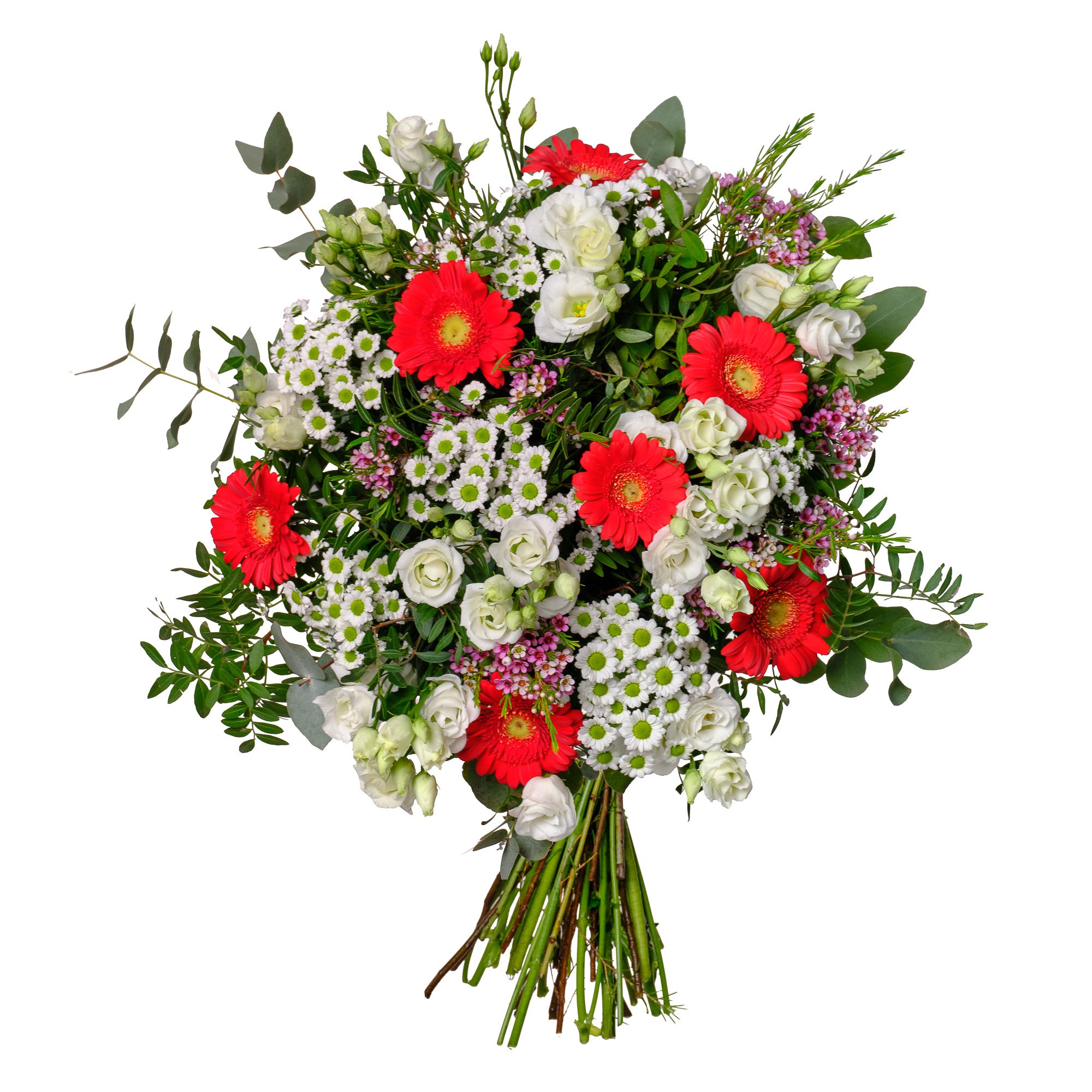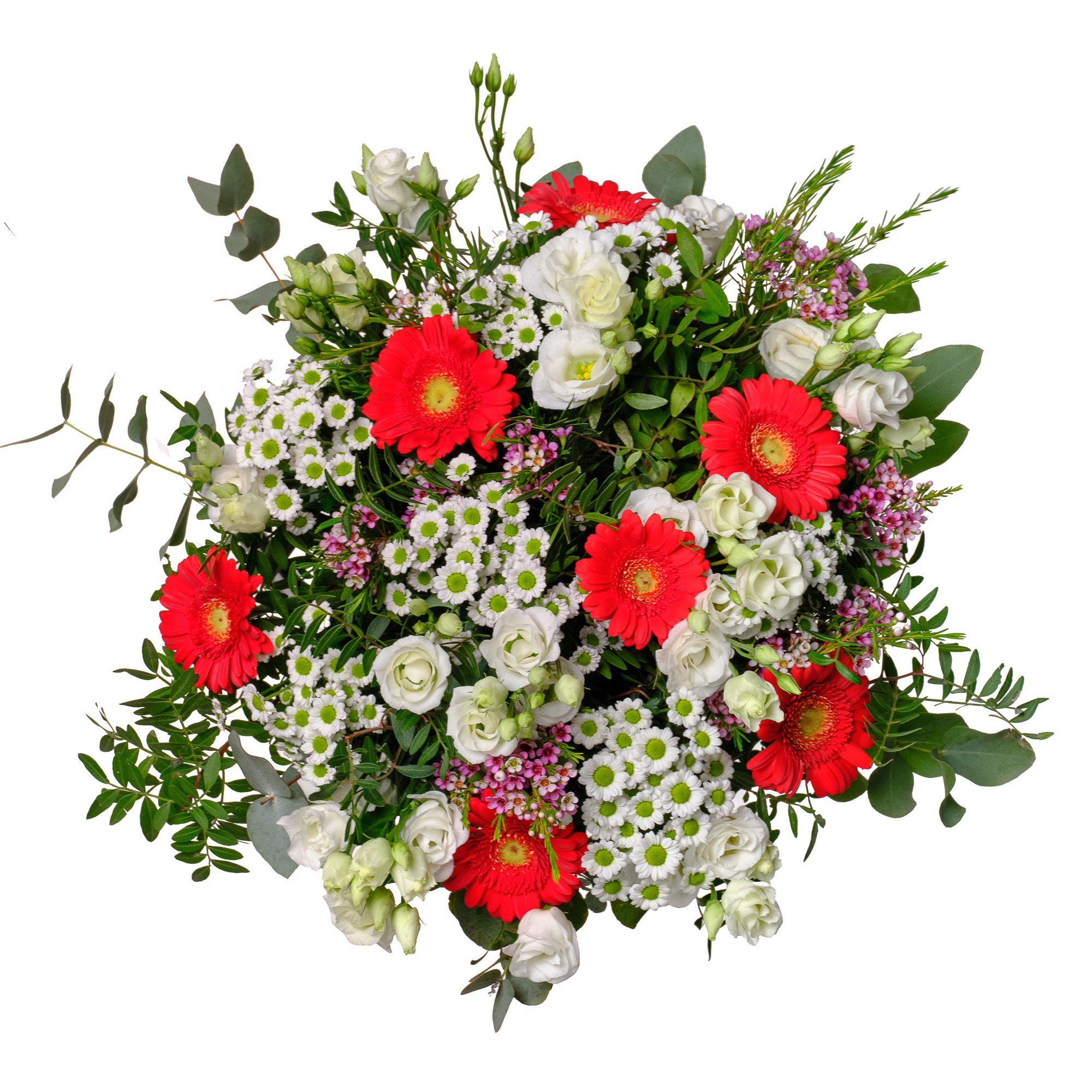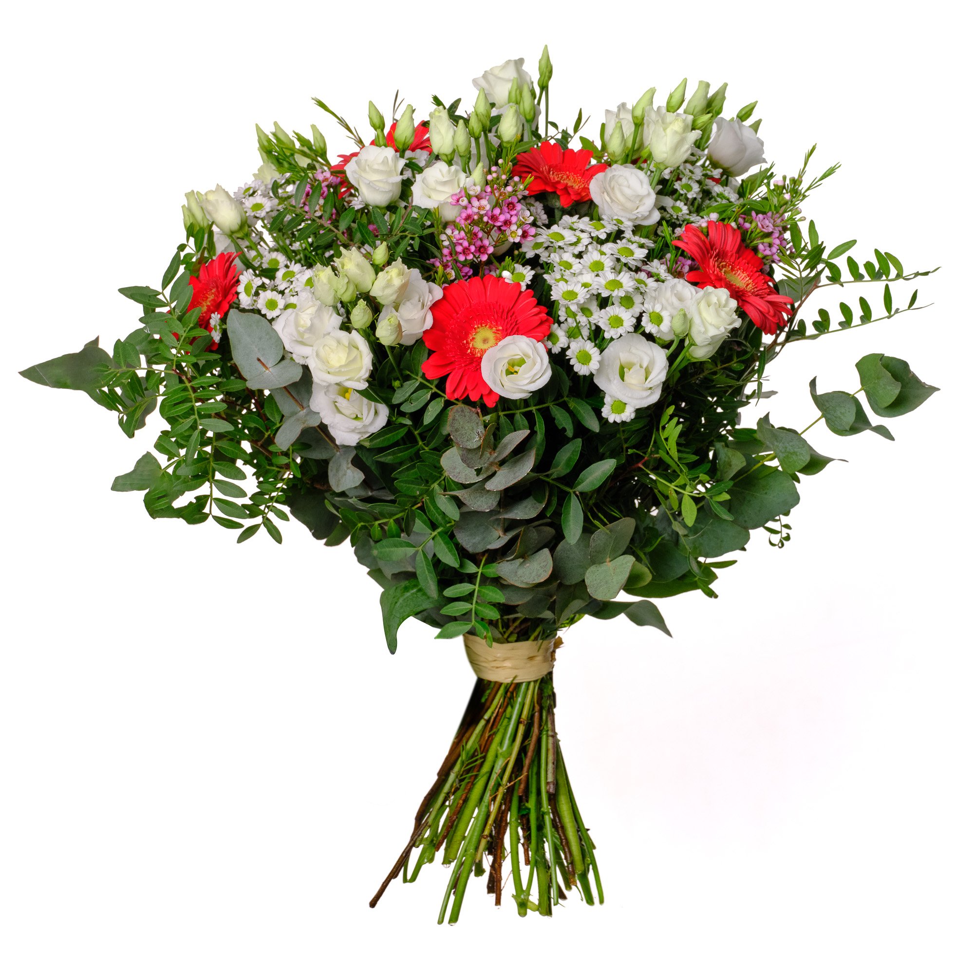 Kytice vyniká svěží kombinací červených gerber, něžných eustom, bílých santin a drobných kvítků waxfloweru. Díky pestrým, ale přirozeně sladěným barvám navozuje veselou a současně elegantní atmosféru. Květiny jsou naaranžované s vkusem, takže působí mimořádně příjemně – vhodné k oslavě důležitých životních okamžiků, k výročí i jen tak pro radost. Vše doplňuje dekorativní zeleň, která dodává kytici svěžest a hloubku. Doručujeme v den objednávky během pracovních dnů a vždy máte možnost zvolit přesný čas doručení. Samozřejmostí je jistota doručení s potvrzením na e-mail. Naše květiny vážou zkušení floristé.