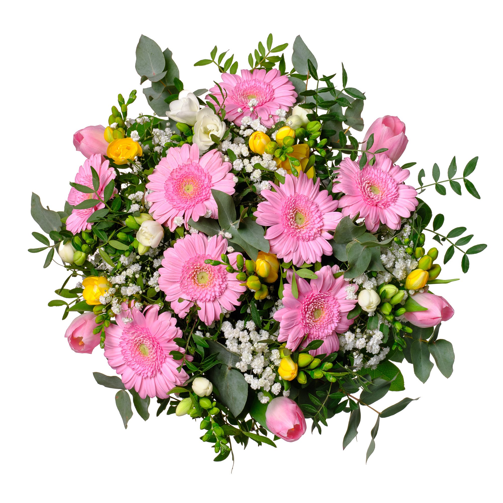 Tato kytice zaujme na první pohled svěží kombinací něžně růžových mini gerber, zářivých tulipánů a bílých i žlutých frézií. Vše krásně doplňuje lehká gypsophila a jemné zelené akcenty eukalyptu a pistácie, které podtrhují přírodní ladění aranžmá. Kytice působí radostně a přirozeně, proto je vhodná jako dárek k narozeninám, oslavám nebo jako milé překvapení pro každodenní zpestření dne. Veškeré květiny vážeme s maximální pečlivostí našimi zkušenými floristy, aby vynikla jejich krása. Doručení zajišťujeme v den objednávky během pracovních dnů a samozřejmostí je potvrzení o doručení e-mailem.