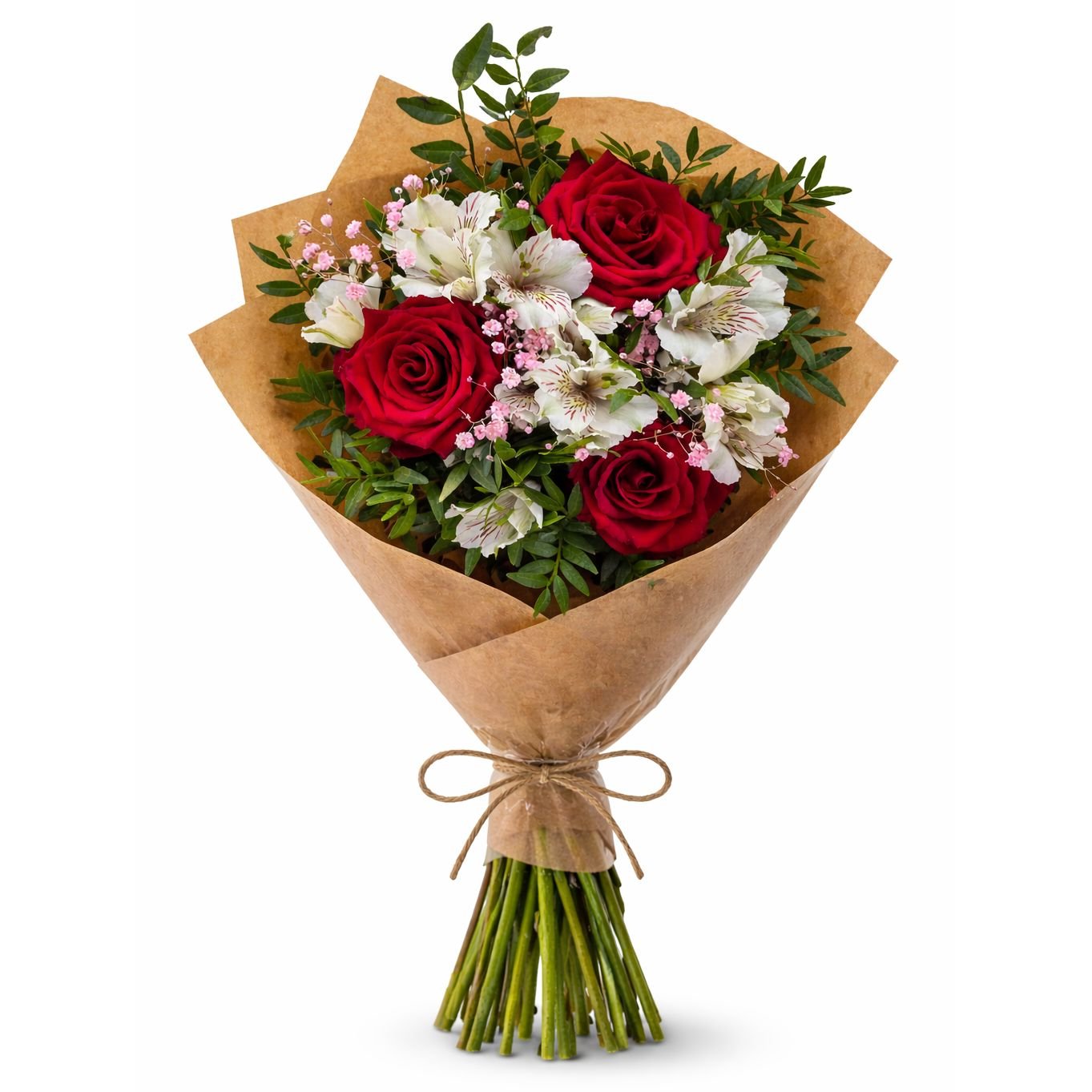Tato elegantní kytice spojuje sílu červených růží s něžností bílých alstromérií a jemných růžových detailů. Výsledkem je harmonická kompozice, která působí romanticky, ale zároveň svěže a přirozeně. Přírodní kraftový obal podtrhuje moderní floristický styl a dává vyniknout intenzivní červené barvě růží.