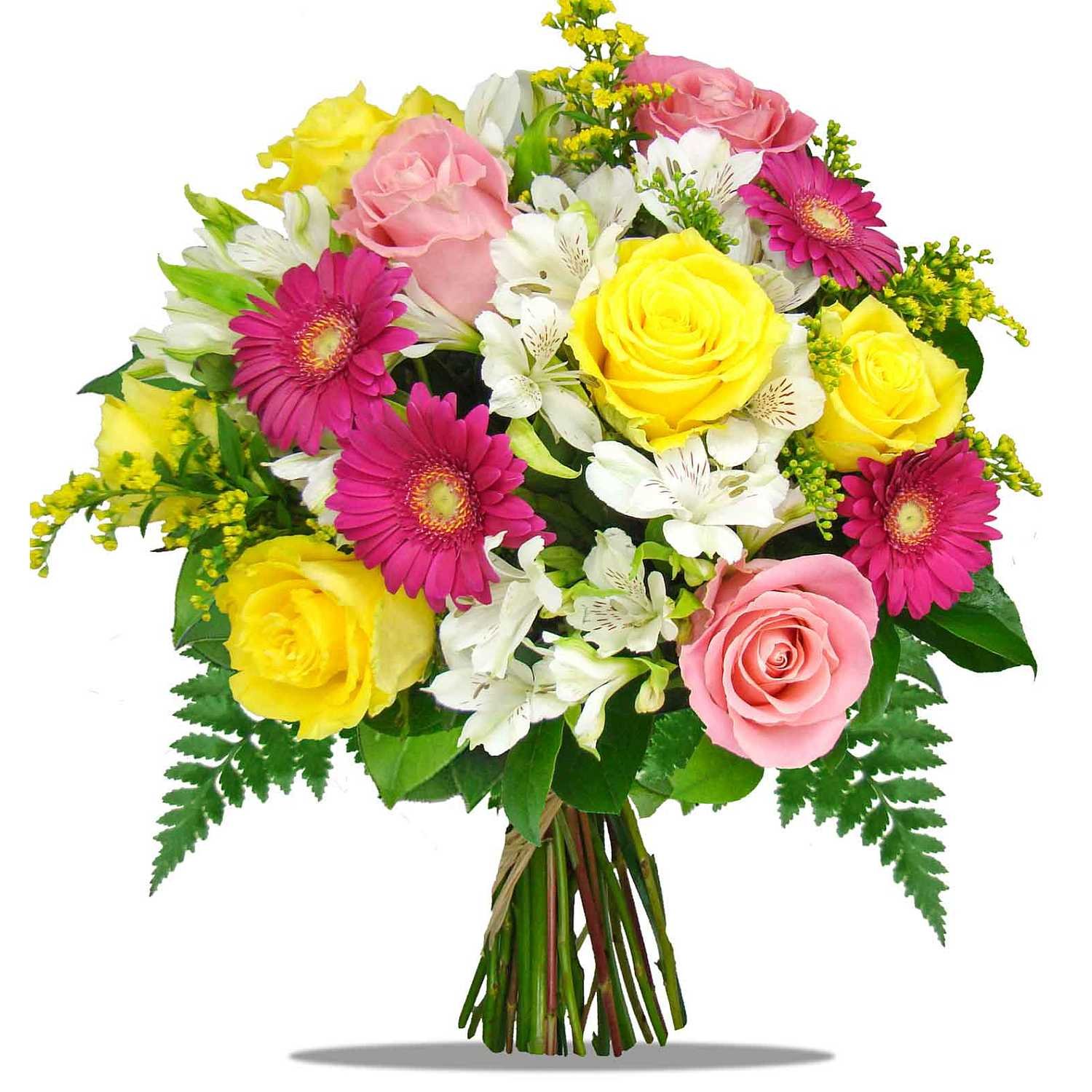 Tato bohatá kytice působí svěže a přirozeně díky harmonické kombinaci růží, germín, alstromérií a jemného solidaga, které kontrastuje s elegantní dekorativní zelení. Růžové a žluté květy spolu nádherně ladí a příjemně prozáří každý interiér. Kytice působí optimisticky a rozzáří den při jakékoliv slavnostní příležitosti, k narozeninám či jen tak pro radost. Doručujeme v den objednávky během pracovních dnů a umožňujeme výběr přesného času doručení. Můžete se spolehnout na jistotu doručení a samozřejmostí je potvrzení o doručení e-mailem. Veškeré květiny vážeme profesionálně – s láskou a pečlivostí našich zkušených floristů.