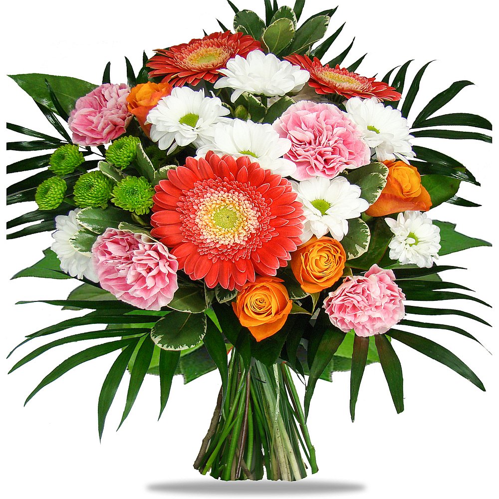 Tato svěží a optimistická kytice je krásnou ukázkou harmonie a zářivých barev. Jemné růžové karafiáty, spolu s výraznými oranžovými růžemi a pevnými bílými a zelenými květy, vytvářejí velmi příjemnou a povzbuzující atmosféru. Kytice potěší při každé příležitosti – perfektně se hodí jako milé poděkování, originální gratulace nebo radostné překvapení. Všechny květiny jsou pečlivě sladěny zkušenými floristy, kteří dbají na preciznost a eleganci každého detailu. Kytici doručujeme v den objednávky během pracovních dnů, nabízíme možnost objednat přesný čas doručení a vždy obdržíte potvrzení o doručení e-mailem. Na přání rádi zodpovíme vše po telefonu.
